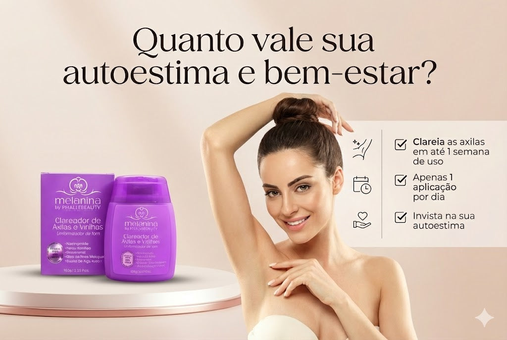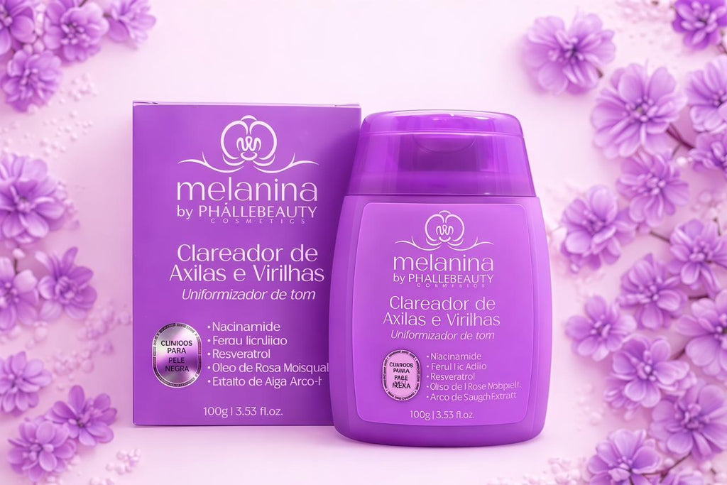 Creme clareador de axilas e virilhas da Melanina by Phállebeauty. Uniformizador de tom com Niacinamida, Ácido Ferúlico, Resveratrol, Óleo de Rosa Mosqueta e Extrato de Alga Arco-Íris. Clareamento visível em até 1 semana de uso. 100g / 3.53 fl.oz.