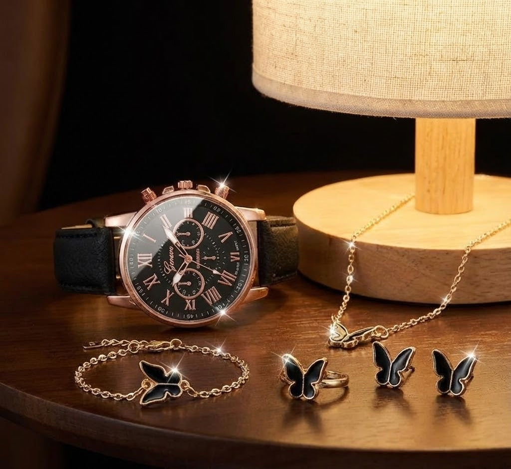 Conjunto elegante de relógio feminino quartz com detalhes em rose gold e pulseira combinando. Perfeito para compor looks sofisticados.